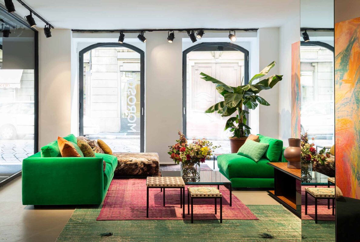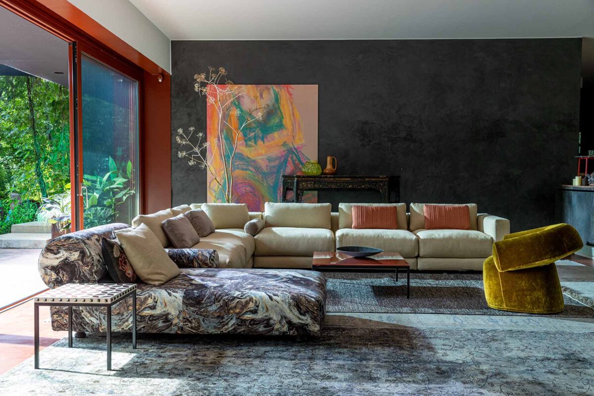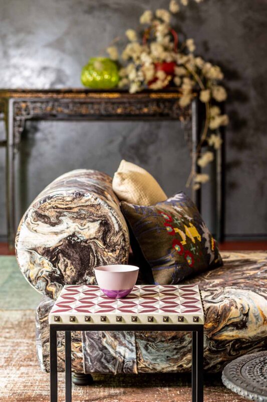 The Salon Nanà collection is the result of a collaboration with the French-Lebanese architect Annabel Karim Kassar. Salon Nanà is a flexible modular seating system that can adapt to all kinds of situations, inspired by Moroccan traditions. A generous silhouette and unique comfort. The sofas are combined with ‘Mezze’, a low traditional daybed used in oriental homes. The collection is completed with a number of square coffee tables with black metal base and top in black marquina, carrara or calacatta marble. A new fabric pendant is also launched with the sofa, called ‘Love me Velvet’, also with Moroccan influences.