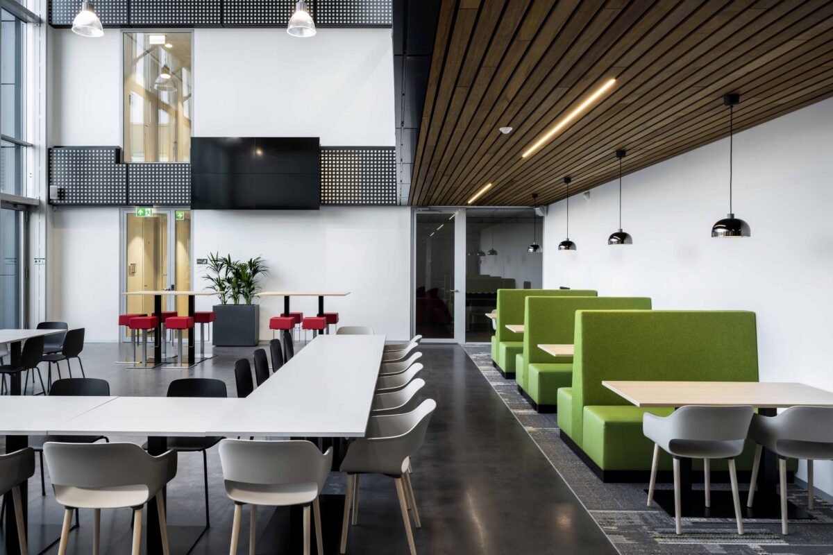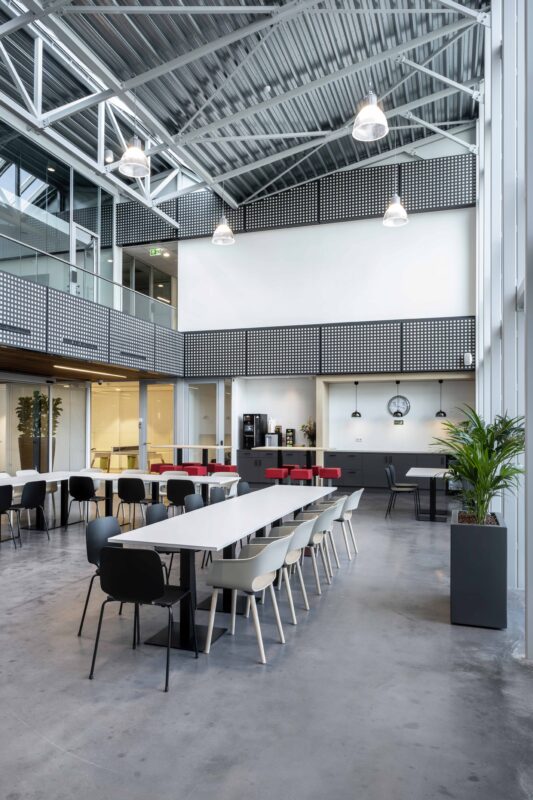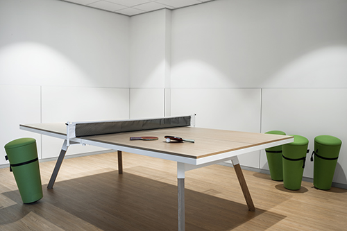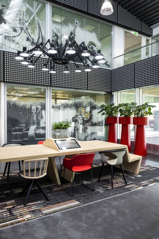 Standing in front of the head office of contractor Van Vulpen, you see a sturdy and transparent building that fits perfectly with the company DNA. Maasdam ensured that you also experience this brand experience indoors. The result is an open work environment with spectacular sight lines that radiate connection. It was a wish of Van Vulpen to maintain as much transparency and open spaces as possible in the building. A lot of Pedrali has been used in the interior and also a Ping Pong table from RS Barcelona.